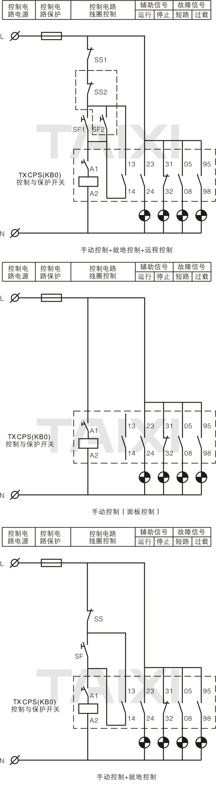 TXCPS(KBO)控制與保護開關電器CPS的主要特征是在單一結構形式的產品上實現集成化的、內部協調配合的控制與保護功能。能夠替代斷路器(熔斷器)、接觸器、過載(或過流、斷相)保護繼電器、起動器、隔離器、電機綜合保護器等多種傳統的分離元器件。 KB0具有遠距離自動控制與就地人力控制兼有的方式進行控制操作的功能,具有協調配合的時間-電流保護特l生,具有控制與保護自配合、短路后連續運行。具有分斷能力高,飛弧距離小、壽命長,具有保護整定電流均可調的特性。操作方便、配套附件模塊多樣齊全等優點,可以實現對電動機負載、配電負載的控制和保護。