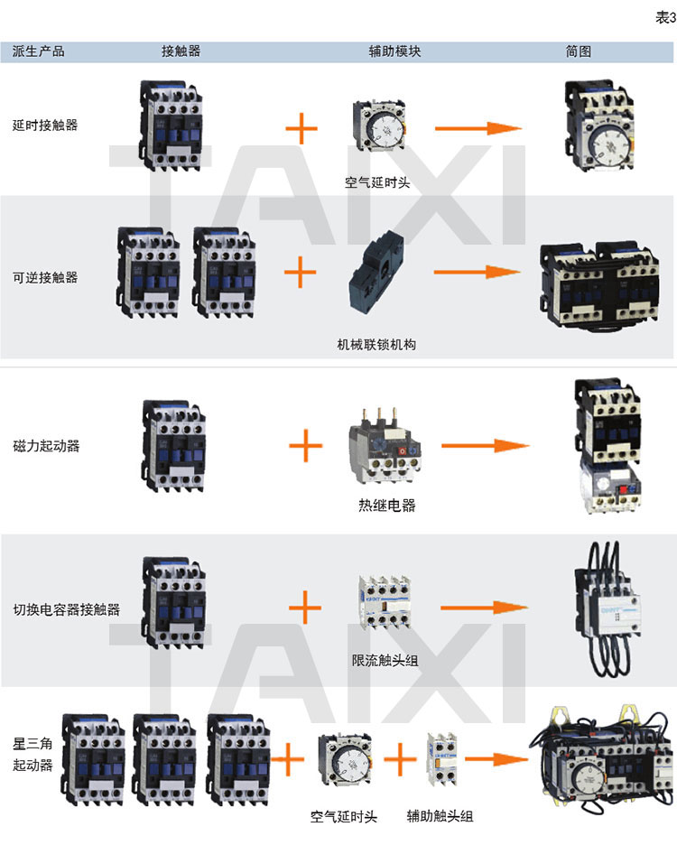 2、接觸器可組成機(jī)械可逆聯(lián)鎖磁力起動(dòng)器,星三角減壓起動(dòng)器,還可根據(jù)用戶選用增加輔助觸頭組、空氣延時(shí)頭等組合多種派生系列產(chǎn)品。